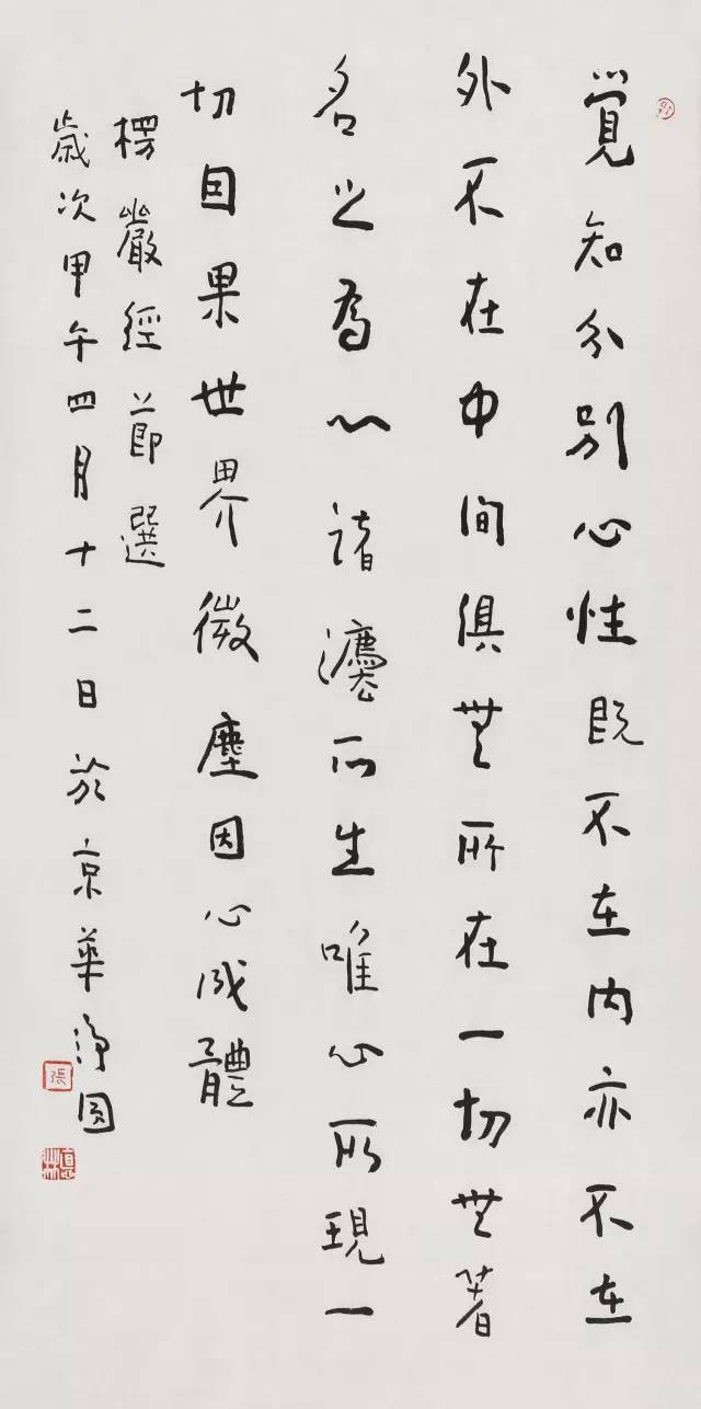 此次展出的作品,是作者于辛卯仲夏在瑯琊古寺禮佛時恭錄的《大佛頂首楞嚴(yán)經(jīng)》《大方廣佛華嚴(yán)經(jīng)·凈行品》《佛說阿彌陀經(jīng)》等佛學(xué)經(jīng)典著作50余件,其中,以楷書丈二尺幅32條屏巨制《金剛經(jīng)》尤為醒目。書體涵蓋了正、草、隸、行等多種書體,代表了作者近年來的最新創(chuàng)作成果。展覽同時首發(fā)了《張德林抄經(jīng)書法集》《張德林楷書金剛經(jīng)》和《張德林書法對聯(lián)集》。