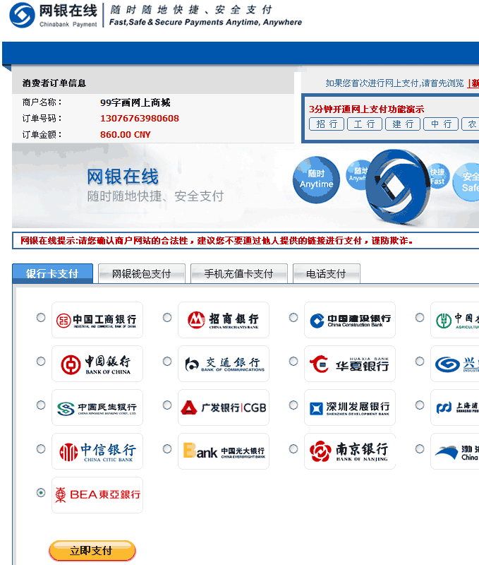 (1)網(wǎng)銀在線支付是通過國內(nèi)各大銀行的支付網(wǎng)關(guān)進(jìn)行操作的,安全性是由銀行方面負(fù)責(zé)的,是完全有保證的。網(wǎng)銀在線不收集用戶的銀行卡資料,當(dāng)用戶需要填寫銀行卡資料時(shí),實(shí)際上已經(jīng)到達(dá)到銀行的支付網(wǎng)關(guān)。所以,用戶不必?fù)?dān)心您的銀行卡資料會經(jīng)由網(wǎng)銀在線泄露;
