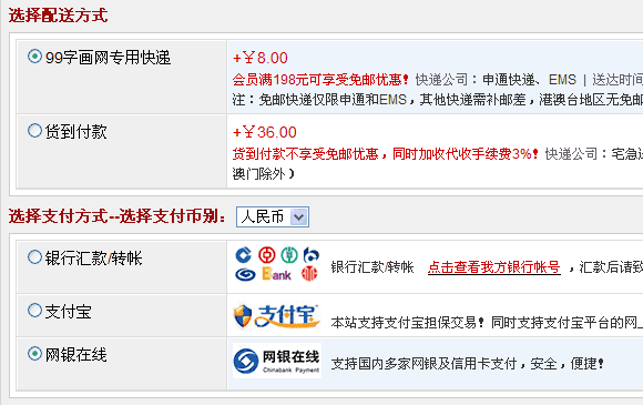 (1)把作品加入購物車后,在填寫詳細(xì)信息提交訂單頁面中,“配送方式”選擇“99字畫網(wǎng)專用快遞”,“支付方式”選擇“網(wǎng)銀在線”。