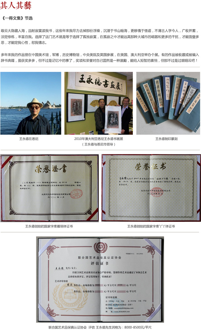 王永德,國家字庫雁翎體、丫丫體創(chuàng)始人,1947年生于洛陽,字一得,號醉翰廬主,別署雁翎。曾長期定居澳洲,在澳大利亞、美國等地多次成功舉辦書畫個展,在當(dāng)?shù)厝A人地區(qū)擁有廣泛的影響力。王永德幼年受伯父民間書法家之啟蒙開始習(xí)字練畫,82年拜王毅然、蔣志林為師,90年拜婁師白入室弟子歷鐸為師學(xué)習(xí)書畫篆刻,93年,入中國書協(xié)培訓(xùn)中心首界高級書法班深造,受到了諸多名家指點(diǎn)?,F(xiàn)為北京書法家協(xié)會會員,中國書法藝術(shù)研究院理事,世界書畫家協(xié)會加拿大總會理事,組織部領(lǐng)導(dǎo)。