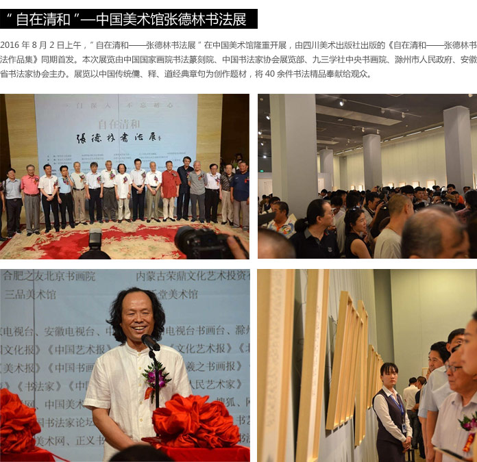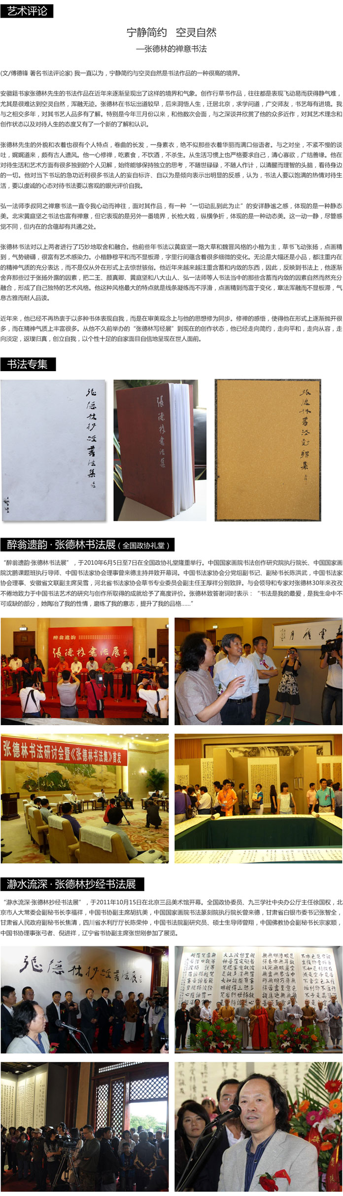 2010年6月在全國政協(xié)禮堂舉辦《醉翁遺韻》張德林書法展,2011年10月在北京三品美術(shù)館舉辦“瀞水流深”張德林抄經(jīng)書法展。出版有《張德林書法集》,《張德林抄經(jīng)書法集》,《張德林對聯(lián)集》,《張德林楷書金剛經(jīng)》等。