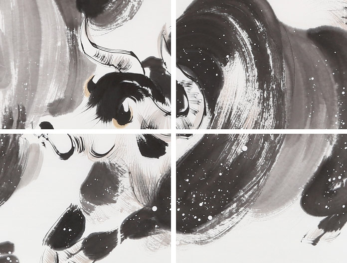 王文煜先生從小居住在甘南草原上,爬雪山、住帳篷,對(duì)青藏高原牦牛之習(xí)性、神態(tài)耳濡目睹,爛熟于胸,尤其對(duì)牦牛“俯首孺子而不逞強(qiáng);鞠躬盡瘁而不居功”的高尚品格和力大無(wú)窮,穩(wěn)步向前,足不踏空、形容無(wú)華,器宇軒昂的氣勢(shì)所感染,以大寫(xiě)意畫(huà)法專(zhuān)攻雪域牦牛,逐漸形成了描繪雪域牦牛風(fēng)馳電掣,飛蹄雷動(dòng)、氣勢(shì)雄強(qiáng),無(wú)堅(jiān)不摧的凌厲畫(huà)風(fēng)。