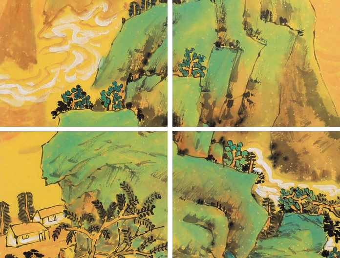山水作品秀美,用筆瀟灑,用墨酣暢,并將水、墨、色融合一體,尤其是作品中的墨色表現(xiàn),濃墨處濃黑透亮,淡墨處逸而朦朧,蓊郁淋漓,氣勢(shì)磅礴,線條疏秀流暢,剛?cè)嵯酀?jì)。