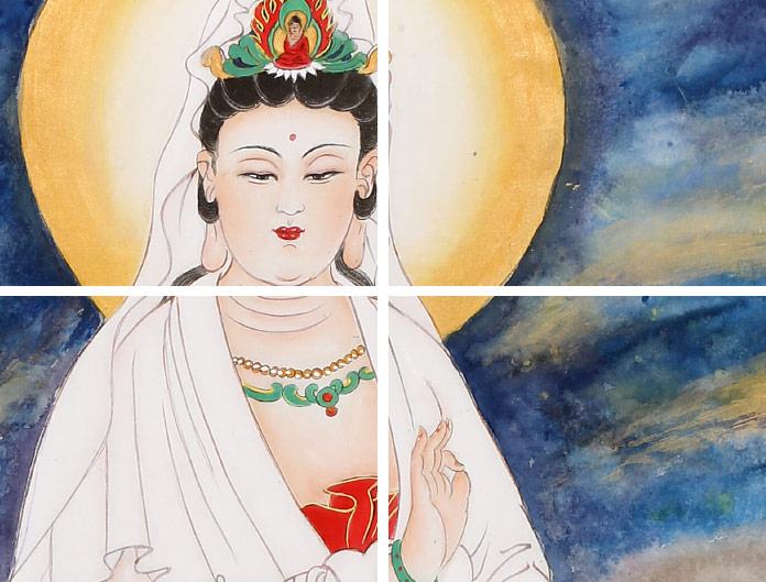 【作品簡評(píng)】 家中供奉佛像之十大利益:1. 從前所作種種罪過。輕者立即消滅,重者亦得轉(zhuǎn)輕。 2. 常得吉神擁護(hù),一切瘟疫、水火、寇盜、刀兵、牢獄之災(zāi),悉皆不受。 3. 夙生怨對(duì),咸蒙法益,而得解脫,永免尋仇報(bào)復(fù)之苦。 4. 夜叉惡鬼,不能侵犯,毒蛇餓鬼,不能為害。 5. 心得安慰,日無險(xiǎn)事,夜無惡夢(mèng),顏色光澤,氣力充盛,所作吉利。 6. 至心奉法,雖無希求,自然衣食豐足,家庭和睦,福祿緜長。 7. 所言所行,人天歡喜。任到何方,常為多眾傾誠愛戴,恭敬禮拜。 8. 愚者轉(zhuǎn)智,病者轉(zhuǎn)健,困者轉(zhuǎn)亨,為婦女者,報(bào)謝之日,捷轉(zhuǎn)男身。 9. 永離惡道,受生善道。相貌端正,天資超越,福祿殊勝。 10.能為一切眾生,種植善根。以眾生心,作大福田,獲無量勝果所生之處,常得見佛聞法。直至三慧宏開,六通親證,速得成佛。 印造經(jīng)像,即有如此殊勝功德,故凡遇祝壽、賀喜、免災(zāi)、祈求、懺悔、薦拔之時(shí),皆宜歡喜施舍,勢(shì)力行之。