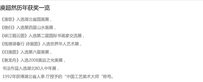 作品《漁歌》入選湖北省國(guó)畫展,《晚歸》入選第四屆山水畫展,《峽江煙云圖》入選第二屆國(guó)際書畫家交流展,《錢塘湖春行 詩(shī)畫圖》入選世界華人藝術(shù)展,《歸漁圖》入選第六屆美展,《賽龍舟》入選2008奧運(yùn)之光美展,書法作品入選湖北80人中年展,1992年獲得湖北省人事 廳授予的“中國(guó)工藝美術(shù)大師“稱號(hào)。