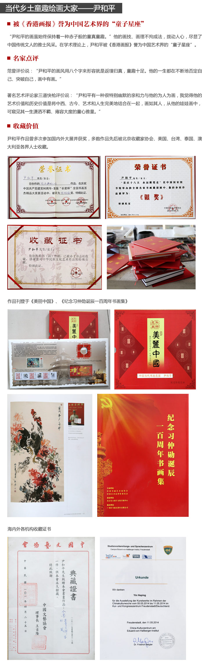 范曾評(píng)價(jià)說(shuō):“尹和平的畫風(fēng)用八個(gè)字來(lái)形容就是‘返璞歸真,童趣十足’”。作品曾多次參加國(guó)內(nèi)外大展并獲獎(jiǎng),多數(shù)作品先后被北京收藏家協(xié)會(huì)、美國(guó)、臺(tái)灣、泰國(guó)、澳大利亞各界人士收藏。在中國(guó)職業(yè)教育與企業(yè)發(fā)展高峰論壇慈善拍賣活動(dòng)中,作品《大吉圖》以26500元義拍支持貧困地區(qū)教育事業(yè)。在臺(tái)灣兩岸文化藝術(shù)交流展上兩件國(guó)畫作品被臺(tái)灣藝術(shù)協(xié)會(huì)收藏,一件作品以十五萬(wàn)臺(tái)幣拍賣成交。