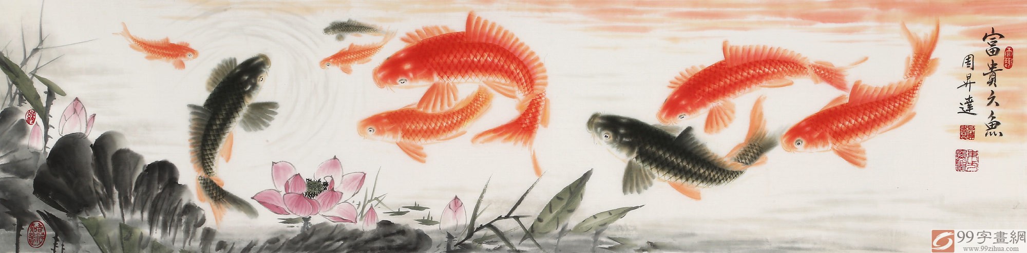 【作品簡評】《富貴久魚》幅繪上了九條鯉魚的圖像?!熬拧比¢L長久久之意?!棒~”取其萬事如意。九條可愛的魚在嬉戲,寓決吉祥如意。 是最常見的家居客廳風水字畫。