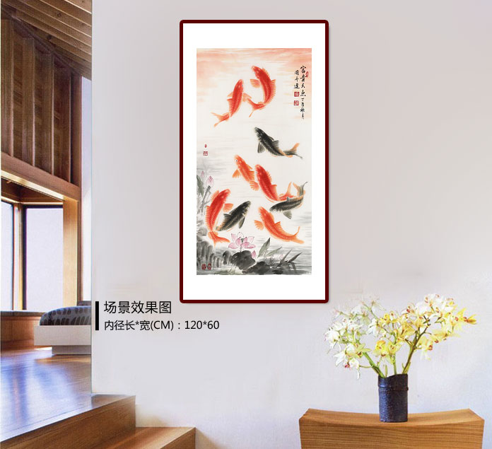 【作品簡評】《富貴久魚》幅繪上了九條鯉魚的圖像?!熬拧比¢L長久久之意?!棒~”取其萬事如意。九條可愛的魚在嬉戲,寓決吉祥如意。 是最常見的家居客廳風水字畫。