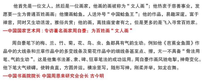 幼年即酷愛(ài)書畫藝術(shù),拜恩師魏中華先生門下學(xué)習(xí)書畫,讀大學(xué)中文,兼工古典文學(xué)與篆刻。后師承著名大寫意花鳥(niǎo)畫家、南京藝術(shù)學(xué)院陳大羽與著名書畫 家古今明先生。擅長(zhǎng)中國(guó)寫意花鳥(niǎo)畫和書法,偶作山水、人物,尤其擅長(zhǎng)禪畫、鯰魚(yú)等題材,并對(duì)其深入研究。 古往今來(lái),畫家作品題材各有所愛(ài)。齊白石喜畫蝦,徐悲鴻喜畫馬,黃胄喜畫驢,李可染喜畫牛,而當(dāng)代書畫家周自豪先生則喜歡畫鯰魚(yú),人送外號(hào)“中國(guó)鯰魚(yú) 王”!