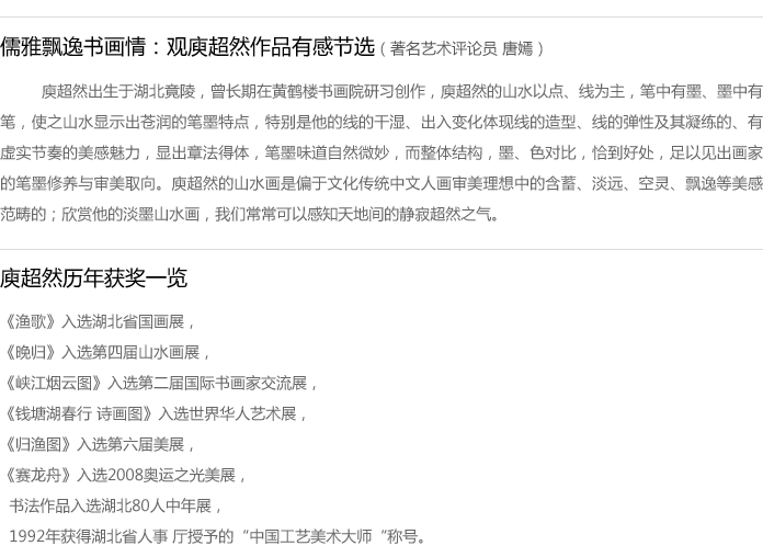 庾超然,原名庾振超,號竟陵山人,湖北著名書畫家,1953年生于湖北竟陵,師從湯文選,趙合儔,李可染,李苦禪,沙孟海等諸多大家,并從古法入 手,師法自然,1972年參加周恩來總理倡導(dǎo)的湖北工藝美術(shù)廠外貿(mào)出口單位,從事專業(yè)繪畫30多年,其間大量作品于美、英、日、韓、新、馬、泰、臺、港展 出并收藏。