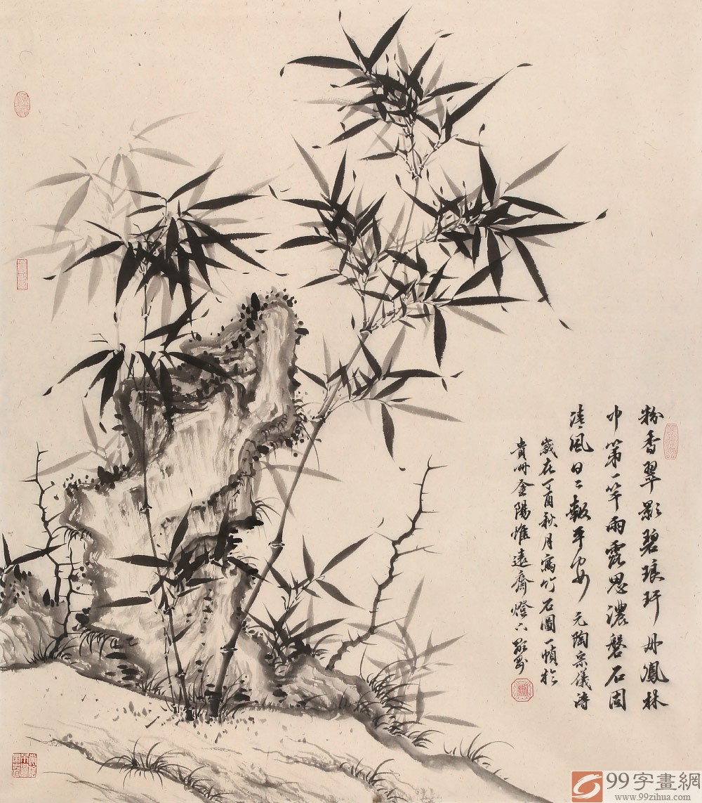 【落款詩(shī)詞】粉香翠影碧瑯玕,丹鳳林中第一竿。雨露恩濃磐石固,清風(fēng)日日?qǐng)?bào)平安。元陶宗儀詩(shī)。