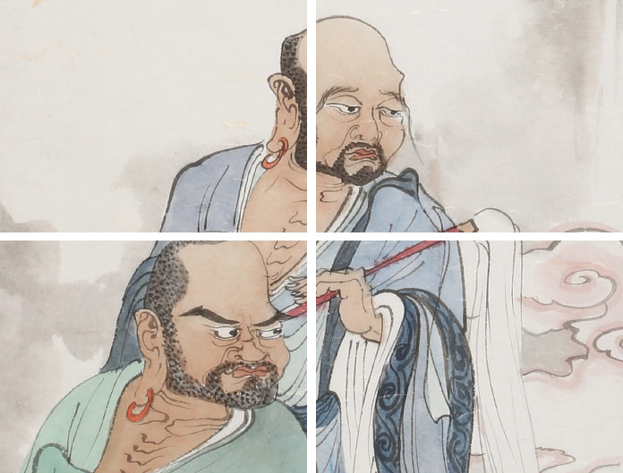 【作品簡(jiǎn)評(píng)】羅漢畫是中國(guó)繪畫史上一門特殊的圖像藝術(shù),在中國(guó)畫史上的分科,屬于道釋人物畫中的佛教畫。在中國(guó),羅漢信仰普遍,在民間羅漢往往被認(rèn)為是神通廣大、古道熱腸的代表。曹建濤的羅漢圖的全用白描的筆法畫出,很能表現(xiàn)線條的韻味,整幅畫,構(gòu)圖簡(jiǎn)潔,帶有文人畫的高雅氣質(zhì),而在羅漢表現(xiàn)神通上,又充滿了禪意。