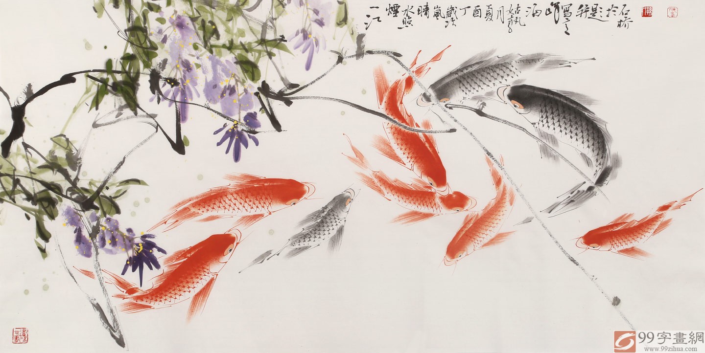 孫海峰的鯉魚畫;以魚為師,得形入神。他的作品以工筆和寫意相間,筆墨勁挺流暢,色彩明潔秀麗。其畫的魚靈動(dòng)活潑,栩栩如生,神韻充盈,筆墨老到。取材來自于生活卻又超越生活。大膽概括簡(jiǎn)化,純墨色的構(gòu)圖也有著豐富的意境,顯示出畫家高超的藝術(shù)功力。