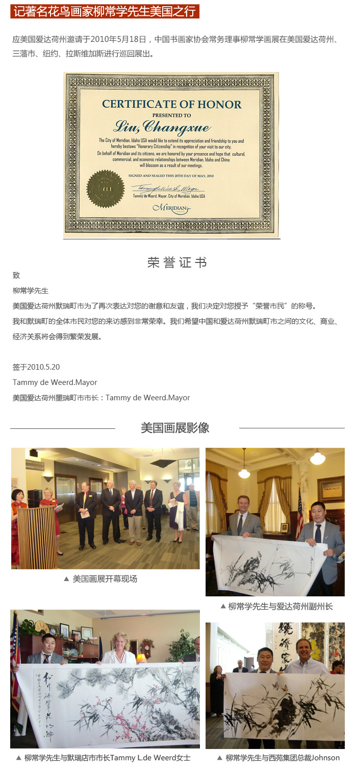 2010年應(yīng)美國愛達(dá)荷州政府邀請赴美舉辦畫展,作品被州政府、墨瑞町市政府、愛達(dá)荷大學(xué)、博伊西大學(xué)、墨瑞町大學(xué)及強生地產(chǎn)、西苑地產(chǎn)收藏,被美國州政府授予榮譽市民及藝術(shù)成就獎。 2011年被授予嶺南文華杰出貢獻(xiàn)獎,同年應(yīng)馬來西亞華僑邀請隨中國文化代表團赴吉隆坡等地舉辦巡回展,并在香港、澳門、臺灣、廣東舉辦各展,作品被當(dāng)?shù)卣秃M馊A人收藏!