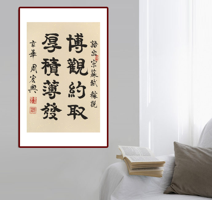 周宏興教授自幼酷愛書法藝術(shù),多年潛心研究與學(xué)習(xí)漢隸名碑,汲取眾家之長,周宏興逐漸形成了自己的凝重,古樸高標(biāo)逸韻的風(fēng)格,可謂典型的“文人書法”。近年來經(jīng)過苦心鉆研,先生又以指代筆,創(chuàng)造了“隸體指書”新書體。被專家譽(yù)為“中國隸體指書第一人,開創(chuàng)書法審美新天地”。 2004年9月29日晚,周先生應(yīng)國家副主席曾慶紅之邀參加了在首都人民大會(huì)堂舉行的中秋國慶招待會(huì),同時(shí)他在人民大會(huì)堂澳門廳向佳賓們展示其隸體指書長卷蘇東坡《水調(diào)歌頭》,引起與會(huì)者極大震驚。 周宏興教授的書法藝術(shù)受到海內(nèi)外廣泛的關(guān)注。他曾四次赴日本舉行書法展和講學(xué)。其作品被我國和日本,韓國,美國,英國,印度,加拿大,馬來西亞等眾多的國際友人珍藏,數(shù)百家藝術(shù)館,博物館和報(bào)刊雜志收藏和刊登,并刻石于北京,山東,云南,廣東,安徽,浙江等地,中南海和全國政協(xié)禮堂均收藏了他的巨幅書法作品,我國黨和國家一些領(lǐng)導(dǎo)人,美國前總統(tǒng)布什,國務(wù)卿奧爾布賴特,希拉里等均收藏了他的隸書或隸體指書作品。