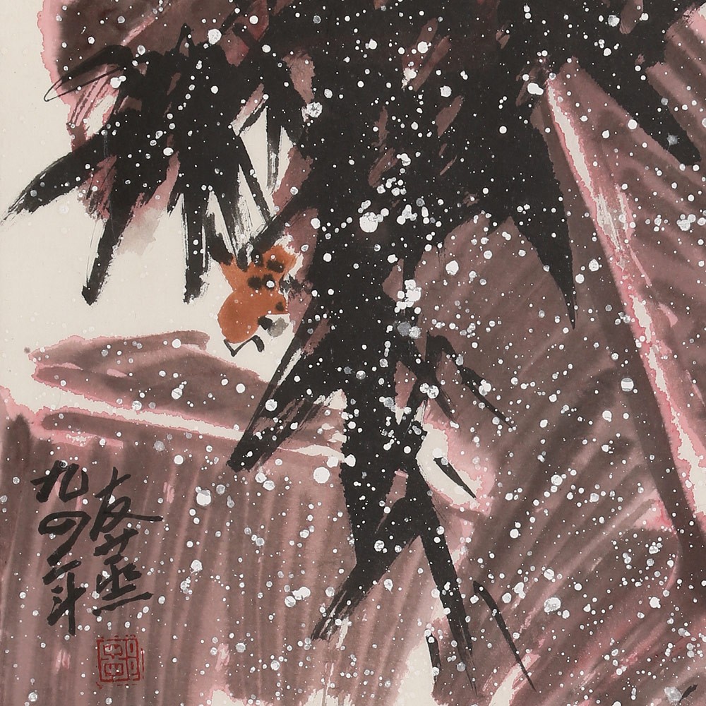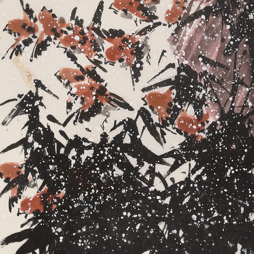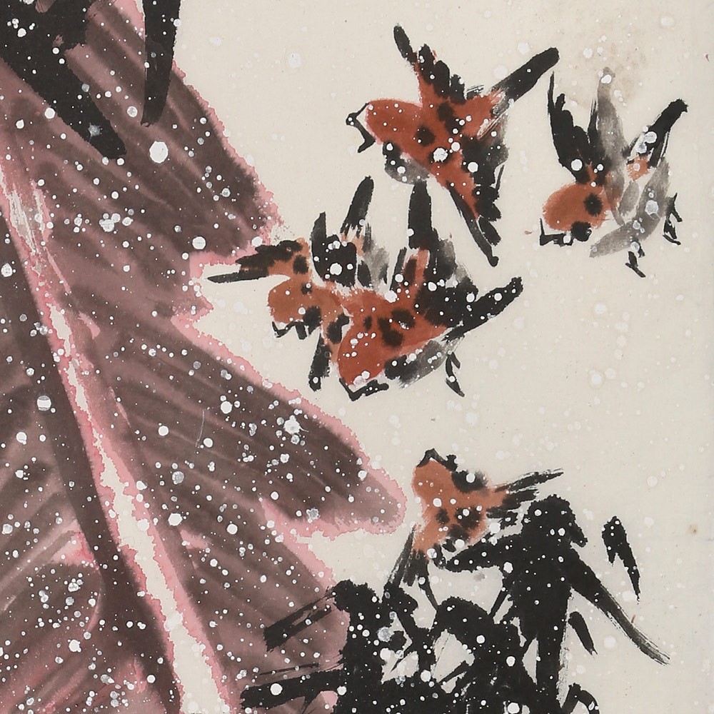 友蒸先生筆下之山水,深弘靜穆,古意盎然,頗具宋明之風(fēng); 花卉翎毛果蔬魚(yú)藻,靈秀飄逸,神氣閑雅,力追八大、吳昌碩等。而以筆簡(jiǎn)神肖之麻雀引領(lǐng)諸寫(xiě)意小品,生氣勃勃,莊諧可人,世譽(yù)“鄒麻雀”。其麻雀畫(huà)技法,被列入世界非物質(zhì)文化遺產(chǎn),《雀陣圖》入編世界吉尼斯紀(jì)錄。