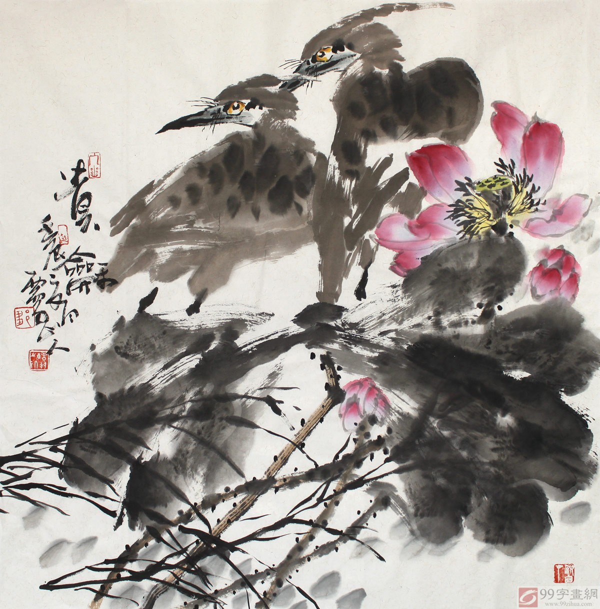 其繪畫崇尚自然和諧之美,追求天人合一,妙境逸品,善于采擷大自然中最生動、最有生命力的東西加以刻畫表現(xiàn),并將自然界中的花草、 禽鳥、 魚蟲在思維中集中強化,使其更突出典型,讓畫面給人以更多的聯(lián)想空間。其用筆追求大開大合,酣暢淋漓。