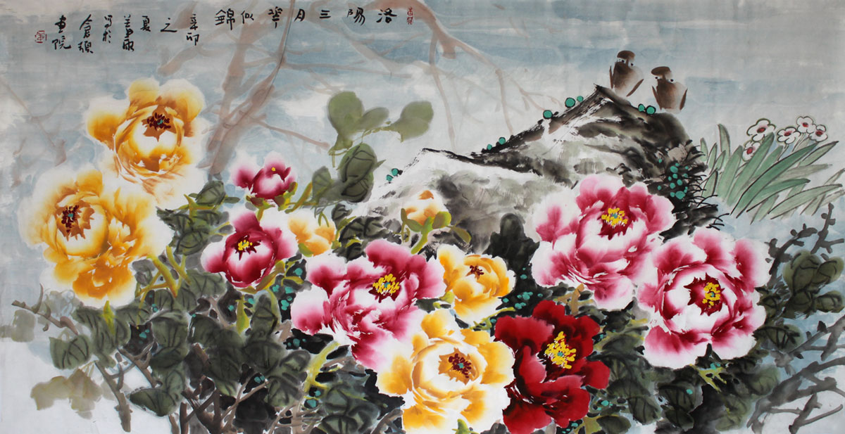 牡丹自古就被人們認為是"繁榮富強,吉祥幸福"的象征,萬花叢中,牡丹獨享著 "國色天香"的美譽。河南自古就是牡丹的故鄉(xiāng),自古牡丹畫家輩出,姜進軍先生自幼研習牡丹,他的牡丹畫在設色方面借鑒和吸收了西洋畫派中注重色彩明暗對比和層次變化的長處及特點,潛心創(chuàng)作了半紅半白,一明一暗同存于一個花頭的"二喬",不僅符合生活的真實,而且給人以藝術的遐想。姜進軍先生的牡丹,枝多枯筆飛白,蒼勁有內含之力;葉多潤毫潑墨,雄渾有蓬勃之氣。枝助花精神,葉托花顏色,這一著意營造格局,使他筆下的牡丹重彩而無俗艷之憾,俏麗而無佻達之嫌。枝頭繁花,形不顯出,葉底群蕾,情態(tài)各異。更兼二三蜂蝶,嗡嗡嚶嚶,戀蕊不去,使畫面神韻倍增。有眾多書畫同仁對他的牡丹評價曰:"骨勁、神勁、風勁、韻勁"。