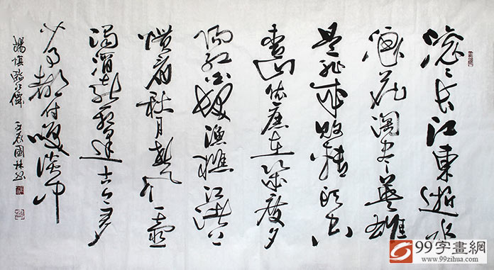 【作品簡評】1955年出生的朱國林先生現(xiàn)定居北京,曾連續(xù)三年獲北京市地書比賽一等獎。觀先生的書法,在當(dāng)代書法家中具有自己獨特的個性與魅力。他的書法,飄逸之中不乏厚重,靈動之中又蘊有勁力,氣息連貫,瀟灑馳騁,虛白相映,剛?cè)嵯酀?jì)。他自言對于書法有一個標(biāo)準(zhǔn)(雅俗共賞),兩個結(jié)合(碑帖結(jié)合,南北結(jié)合),三個不要忘記(不要忘記民族特色、時代特征、個人特點)。這是他幾十年書法創(chuàng)作的總結(jié)。 他的書法,不生澀,不造作,飄逸剛毅,自成一格。
