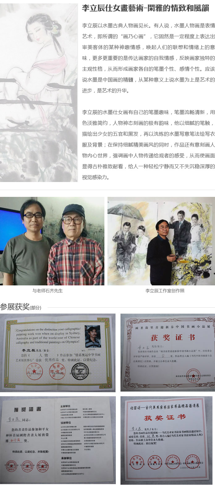 李先生的仕女圖體現(xiàn)了顯著的寫實(shí)主義風(fēng)格的同時(shí)又大膽的運(yùn)用了寫意畫法,特別是以筆墨展示東方女性的美,極力刻畫人物面部特別是眼睛的神韻和精妙,形成了獨(dú)特的淡雅簡約的風(fēng)格。他的作品極具裝飾與收藏價(jià)值。