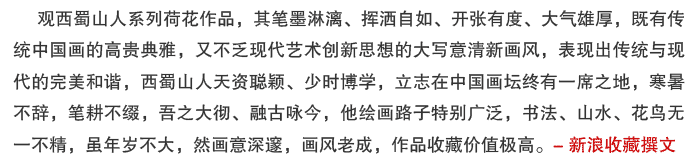 【作品簡(jiǎn)評(píng)】觀西蜀山人系列荷花作品,其筆墨淋漓、揮灑自如、開張有度、大氣雄厚,既有傳統(tǒng)中國畫的高貴典雅,又不乏現(xiàn)代藝術(shù)創(chuàng)新思想的大寫意清新畫風(fēng),表現(xiàn)出傳統(tǒng)與現(xiàn)代的完美和諧,西蜀山人天資聰穎、少時(shí)博學(xué),立志在中國畫壇終有一席之地,寒暑不辭,筆耕不綴,吾之大徹、融古詠今,他繪畫路子特別廣泛,書法、山水、花鳥無一不精,雖年歲不大,然畫意深邃,畫風(fēng)老成,作品收藏價(jià)值極高。