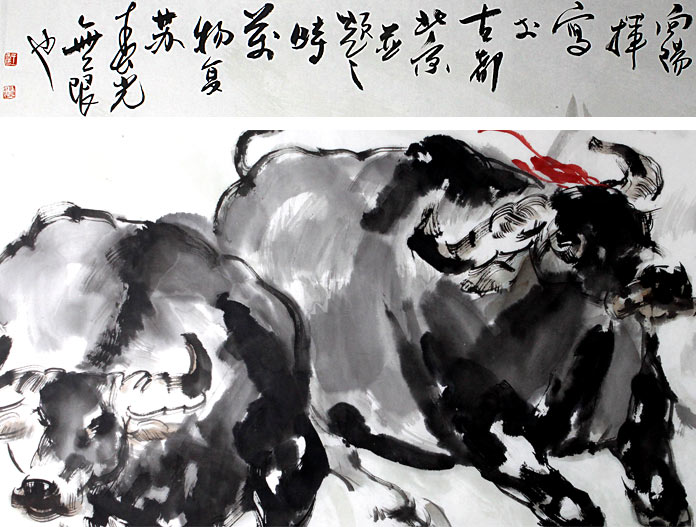 【作品簡(jiǎn)評(píng)】此幅《五牛圖》是一幅表現(xiàn)草原風(fēng)情的水墨寫意動(dòng)物畫,圖中所繪五頭神態(tài)各異、并排前行的牛,或行,或立,或俯首,或昂頭,動(dòng)態(tài)十足,墨色濃淡融合自然,層次豐富,顯示出畫家高超的筆墨控制能力和堅(jiān)實(shí)的造型能力。雖然畫面上只有少許背景襯托,完全以牛為表現(xiàn)對(duì)象,如果不是對(duì)牛進(jìn)行了細(xì)致的觀察,對(duì)牛的造型描繪有十足把握的話,藝術(shù)家也不會(huì)將其五頭形狀百態(tài)的牛繪制于畫幅中,畫家勾勒牛的線條雖然簡(jiǎn)潔,但是畫出的筋骨轉(zhuǎn)折和筆墨濃情十分到位,??诒翘幍慕q毛更是細(xì)致入微,目光炯炯的眼神體現(xiàn)了牛們溫順而又倔強(qiáng)的性格。