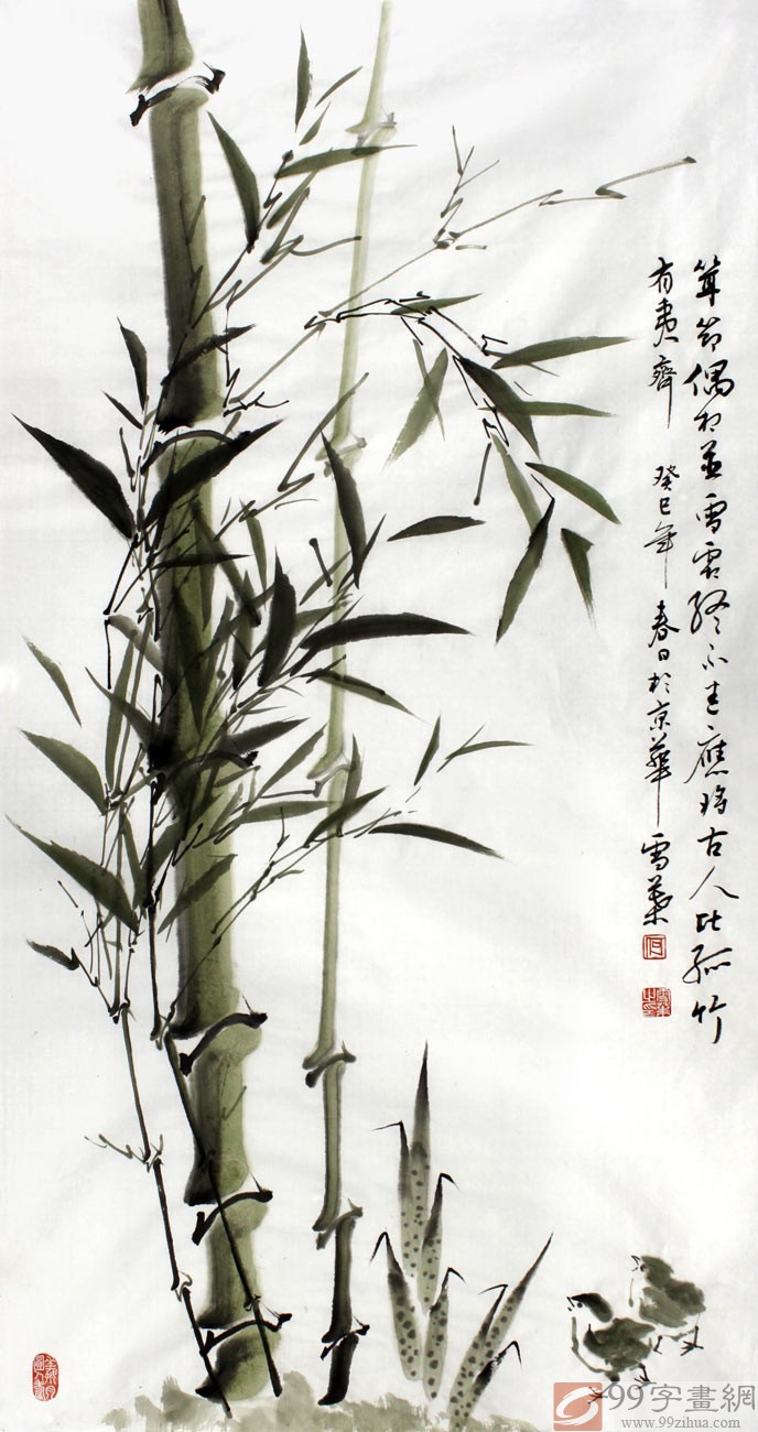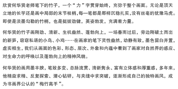 【作品簡(jiǎn)評(píng)】(99字畫(huà)網(wǎng)藝術(shù)評(píng)論員路豐)哲人指點(diǎn)江山,儒者漫寫(xiě)梅竹。何華賢先生雖已近六旬,癡于畫(huà)藝40余年,然對(duì)待藝術(shù)仍然孜孜不倦,他正是這樣無(wú)數(shù)次對(duì)竹的點(diǎn)、線、墨、色的不同處理,用其獨(dú)特的繪畫(huà)語(yǔ)言表現(xiàn)出竹子的清雅、淡泊、剛正、蒼勁、堅(jiān)毅、灑脫、虛懷、古樸……欣賞先生筆下的竹子,讓人仿佛置身竹林,走進(jìn)了千峰竟秀、萬(wàn)竹滴翠、清風(fēng)徐徐、竹韻蕭蕭的大自然中,在這竹的世界中,空氣如同已洗濯過(guò)的清新,凡塵俗世的喧囂和嘈雜逐漸遁去,人的心靈也像被一只溫潤(rùn)的手撫過(guò),沉浸在精神回歸自然的境界中。