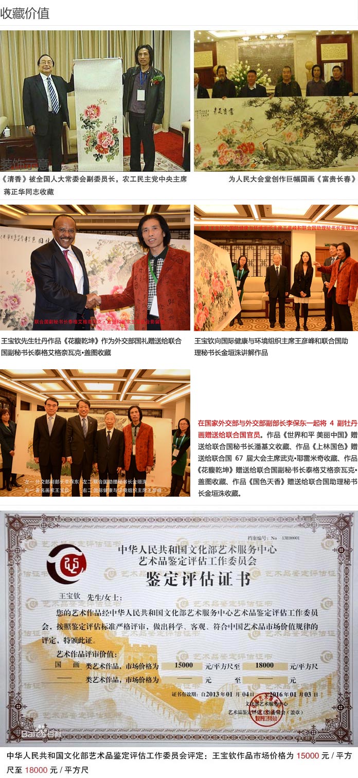 2005年參加全國新聞人物表彰大會,為大會獻(xiàn)出巨副佳作《牡丹圖》受到全國政協(xié)副主席張克輝,全國人大常委會副委員長布赫等中央領(lǐng)導(dǎo)的高度評價,被人民大會堂收藏并譽(yù)為“ 中原牡丹王 ”,同時又榮獲了“ 全國百佳新聞人物優(yōu)秀文化工作者 ”稱號。人民日報社領(lǐng)導(dǎo)為牡丹圖題“ 百花園里最瑰麗,大會堂中展風(fēng)采 ” 。作品《富貴吉祥》被編入《中國書畫作品集》,《情趣》被編入《中國當(dāng)代書畫家收藏大典》,《國色天香》被編入《中華魂》,《富貴滿堂》、《細(xì)雨和風(fēng)》等作品入編《中國當(dāng)代名流研究》 。《牡丹圖》、《花鳥條屏》先后被美國、加拿大、新加坡、馬來西亞、香港等國內(nèi)外知名人士珍藏。