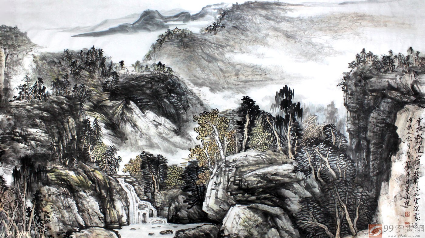 【作品簡評】(99字畫網(wǎng)藝術(shù)評論員玉潔)認真品味鄭慶年先生的山水畫的作品,大氣磅礴,濃淡墨相宜,千變?nèi)f化,氣韻生動。在創(chuàng)作中,他力求做到在形、韻、色、意、內(nèi)涵、神韻變化、技法運用等方面和協(xié)統(tǒng)一,使其畫面活躍出空間感、直觀感、靈動感和立體感,意味深長,意境悠遠,讓觀賞者產(chǎn)生無限的想象力。鄭先生通過對大自然的仔細觀察和理解,把粗曠宏偉的山水氣勢凝聚于筆端,用細膩滋潤的筆法,表現(xiàn)出山水之靈性,自然之神韻,使其作品達到“山水之秀,畫中之美” 的絕佳效果,從而讓自然與藝術(shù)融為一體,給人一種氣勢磅礴、賞心悅目、心曠神怡的風(fēng)景視覺效果。——節(jié)選自中國青年報《藝術(shù)是沒有捷徑可走的—著名山水畫家鄭慶年》