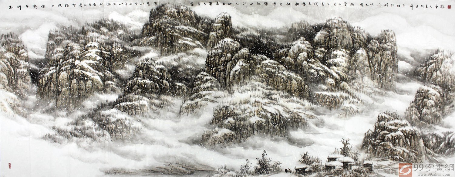 【作品簡(jiǎn)評(píng)】(99字畫(huà)網(wǎng)藝術(shù)評(píng)論員周俊征)趙金鸰的這幅《太行冬韻圖》,展現(xiàn)了一副絕妙的太行山村雪景,圖中銀裝覆蓋了群山、峽谷、樹(shù)木、山路和居民,整個(gè)山村沉浸在煙云滔滔的冬霧里,儼然一幅完美絕倫的水墨畫(huà),無(wú)不讓人陶醉其中。趙金鸰的寫(xiě)意山水畫(huà)力求創(chuàng)新,黑白灰相間錯(cuò)落有致,點(diǎn)線面交織渾然天成,同時(shí)作者也強(qiáng)化積極向上的情緒,融自然之美、純樸之美而升華為藝術(shù)之美,筆墨間營(yíng)造出回歸自然的意境,仿佛讓人暢游于太行山雪景中,力求達(dá)到詩(shī)情畫(huà)意的境界。此橫幅掛于大廳或辦公場(chǎng)所皆能彰顯氣派,提升品位。