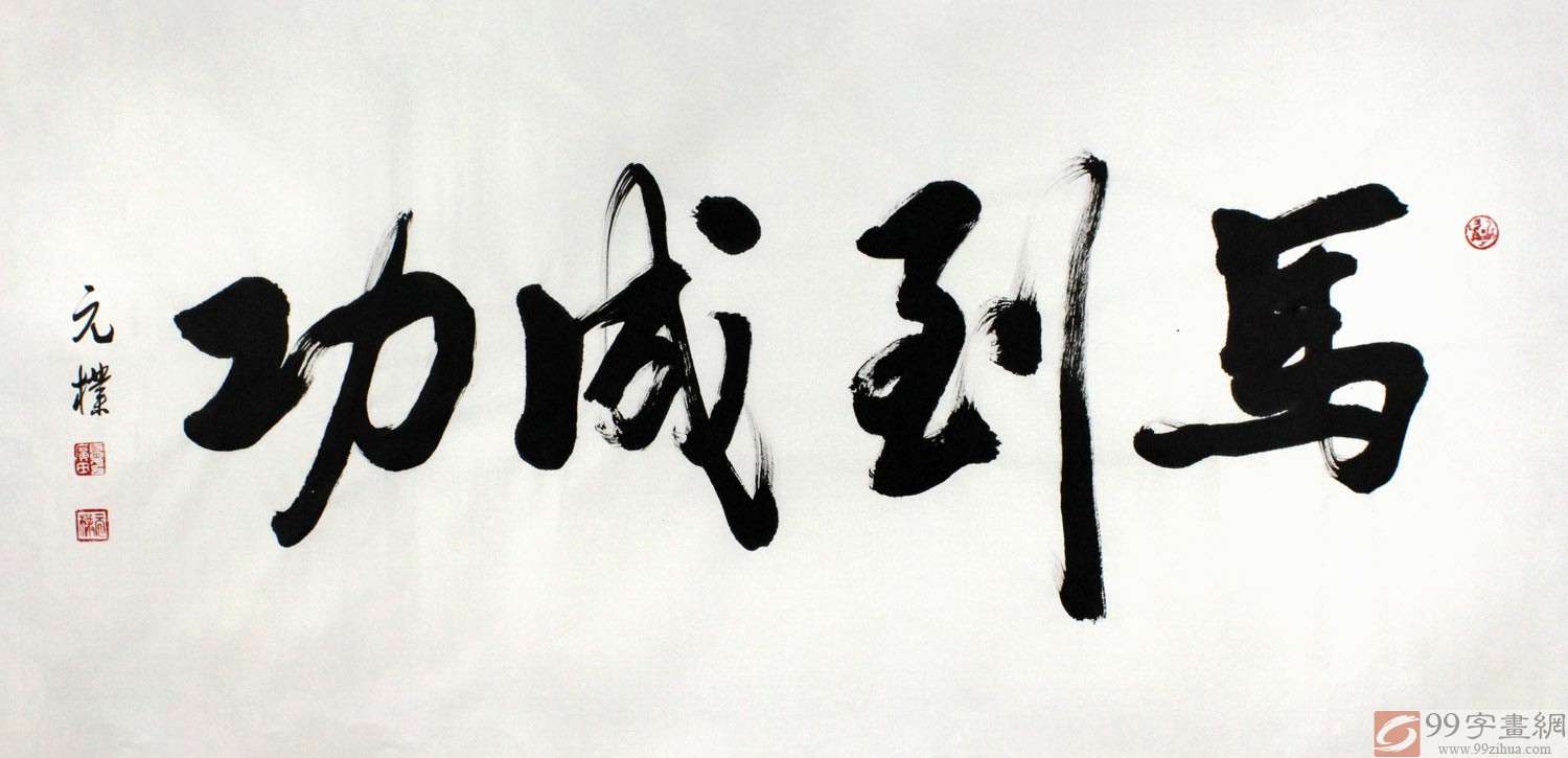 【作品簡評】(99字畫網(wǎng)藝術(shù)評論員路豐)“馬到成功”,象征中華民族的騰飛,從四字來看字?jǐn)?shù)相連、貫穿其中又是一條巨龍,可謂龍馬精神,激勵人們奮發(fā)進(jìn)步,是華夏民族精神的象征。整幅《馬到成功》書法筆力雄渾、灑脫流暢、蒼勁圓潤、厚重沉穩(wěn),凸顯作者深厚的書法功力,鏗鏘有力的著墨給觀者以藝術(shù)沖擊力,再加之其良好的寓意,能給人帶來強(qiáng)大的自信去迎接一切挑戰(zhàn),無往而不利,同時,有助主人升遷,轉(zhuǎn)業(yè),移民,升學(xué)等,適合家居客廳、辦公室懸掛裝飾!