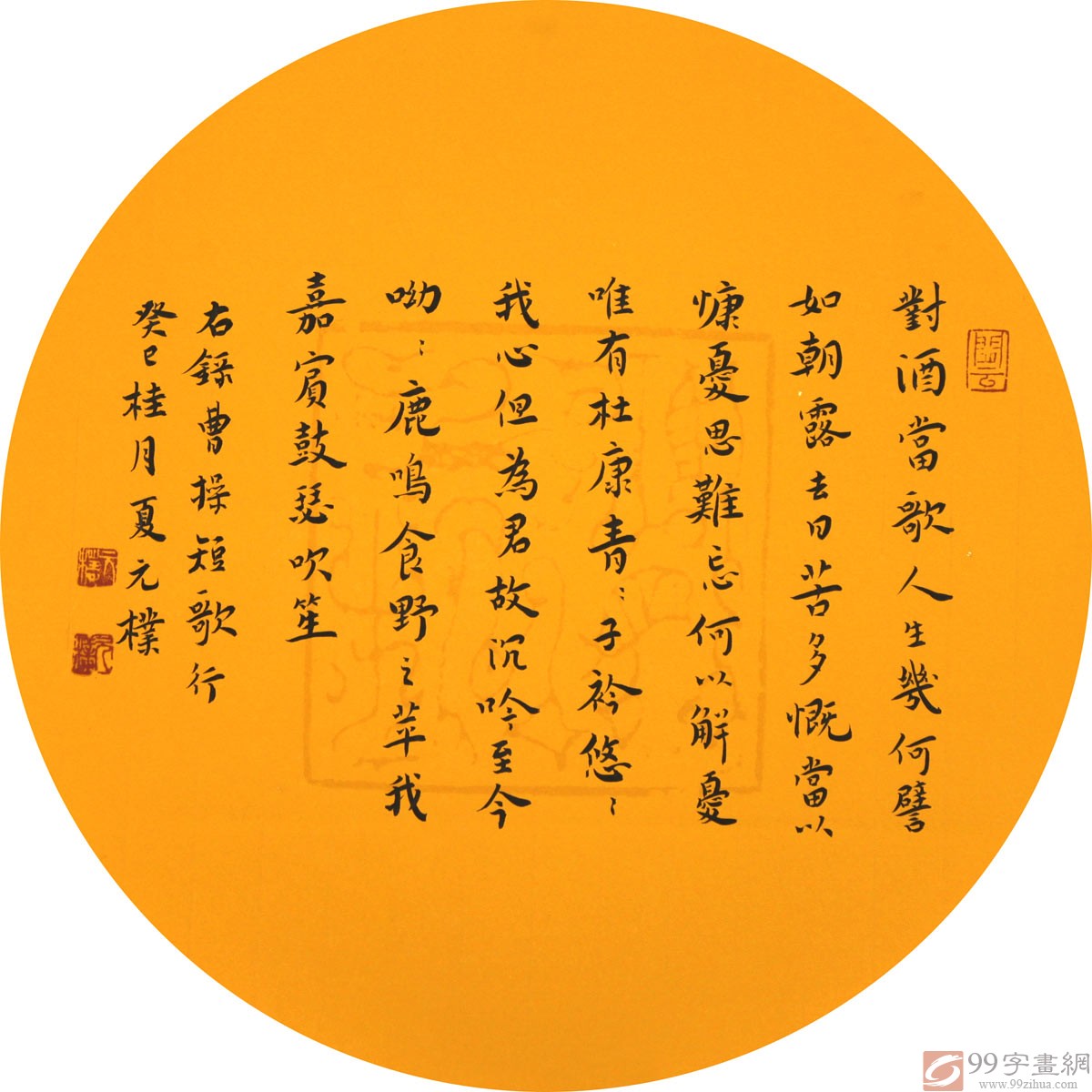 【作品簡評】(99字畫網(wǎng)藝術(shù)評論員曉曼) 這首詩詞書法《短歌行》是曹操最具代表性之作。全詩通過對時光易逝、賢才難得的再三詠嘆,抒發(fā)自己求賢若渴的感情,表達統(tǒng)一天下的雄心壯志和自強不息的進取精神。全詩內(nèi)容深厚,莊重典雅,感情充沛,氣魄雄偉,想象豐富,古樸自然,是辦公室字畫、客廳字畫之選!