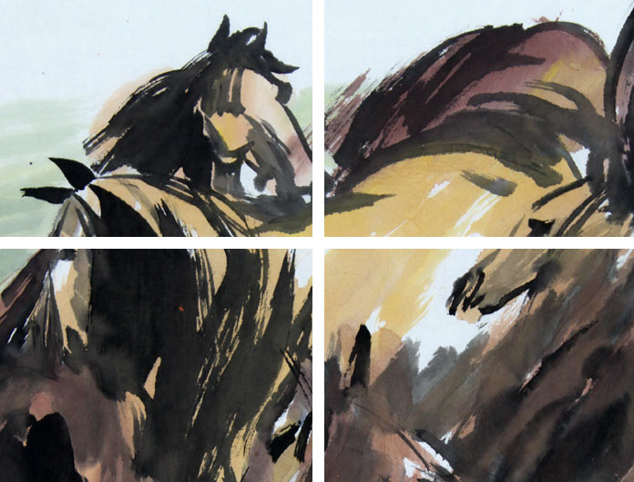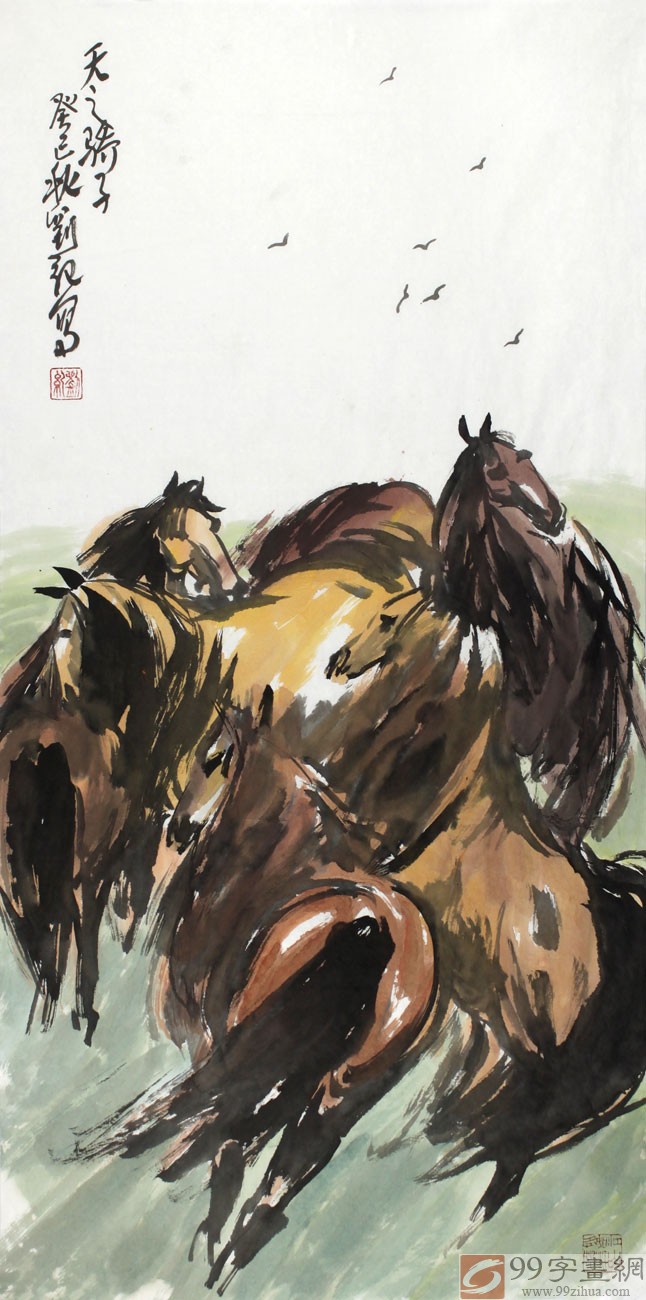 【作品簡評】 (99字畫網(wǎng)藝術(shù)評論員曉曼)此幅駿馬圖《天之驕子》是劉紀先生的近期力作。先生繪一路馳騁、狂奔不已的奔馬長奔而來,它們漸漸安靜了下來,互相親昵望著對方,安慰著、鼓勁著,在青色的草地上,更顯馬之高貴、堅強、優(yōu)雅,有著一種全新的藝術(shù)觀賞價值,從而感受國畫帶給大家的無窮魅力,而每個馬又表現(xiàn)出不同的姿態(tài)展現(xiàn)給觀者,一動一靜之間,給人以無盡的藝術(shù)享受。是辦公室字畫的精品之作,推薦選購!