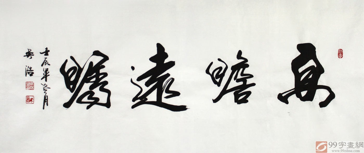 【作品簡評】(99字畫網藝術評論員玉潔)“高瞻遠矚”意思就是說站得高,看得遠,比喻眼光遠大,同時也比喻前途寬廣,事業(yè)蒸蒸日上!在吳浩先生的這幅書法作品中,先生的每一幅書法作品認真而嚴謹,盡量達到完美,他十分重視作品的整體神韻和章法的隨意成妙,他的行楷書格調高雅、自然灑脫、點劃精到;行書筆力遒勁、氣韻暢達、意趣橫生。