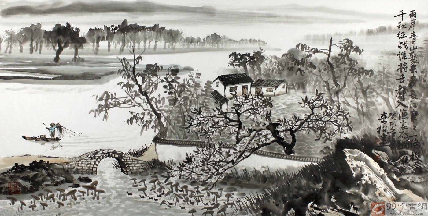【作品簡評】 (99字畫網(wǎng)藝術(shù)評論員曉曼) 黃奇松先生的這幅水墨山水畫《兩岸青山聚米多》,水墨設(shè)色,遠處的樹林排成一排,若隱若現(xiàn),意境深遠,房屋、拱橋、樹木、松石、河中的鴨子等構(gòu)成了一幅秀雅而又奇妙的山水畫作。一漁民劃槳遠去,手掀一漁網(wǎng),游魚在網(wǎng)中束縛著,凸顯漁民此時歡悅和豐收的心情。整幅山水畫作品構(gòu)圖飽滿、意境深遠、濃淡墨相宜、線條流暢等,體現(xiàn)畫家深厚的藝術(shù)功底,是辦公室字畫、書房字畫之選,推薦選購!