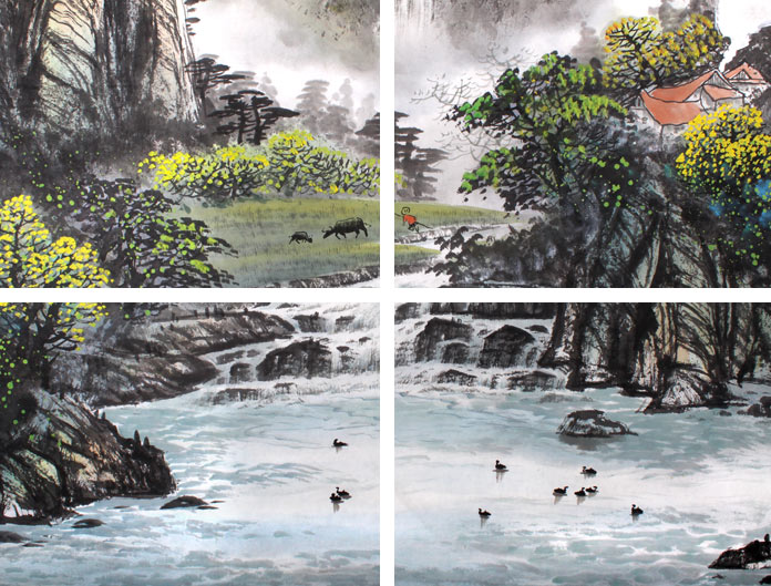 【作品簡評(píng)】(99字畫網(wǎng)藝術(shù)評(píng)論員玉潔) 張慧仁先生的青綠山水畫《家住青山綠水間》構(gòu)圖飽滿,林木叢生,枝葉繁茂,煙霧滾滾而來,瀑水生生不息流淌,河中的鴨子,天空中的大雁,砍柴而歸的主人,曲曲折折的小路,拱橋一座,房屋數(shù)舍掩映于山腰中,一牧童放牛,青翠的草地,澄澈的湖水,云蒸霞蔚,一幅青綠山水畫作映入畫幅中,是辦公室字畫、客廳字畫之選推薦選購!