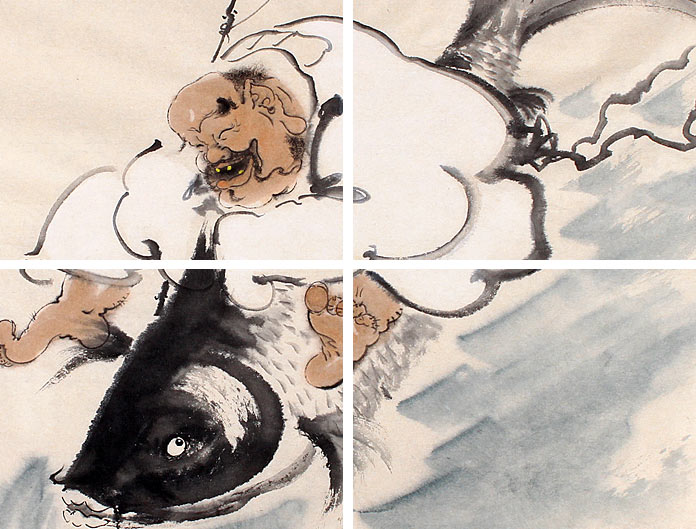 【作品簡(jiǎn)評(píng)】(99字畫網(wǎng)藝術(shù)評(píng)論員曉曼) 《魚翁樂(lè)》繪一魚翁駕一鯉魚在水中暢游的場(chǎng)面。雙腿抬起,面帶微笑,馳騁于海洋之中,氣勢(shì)壯觀,翱翔于天際,奔波于海洋,一幅喜慶的畫幅映入其中。整幅畫面構(gòu)圖奇妙,造型講究,乃精品字畫!