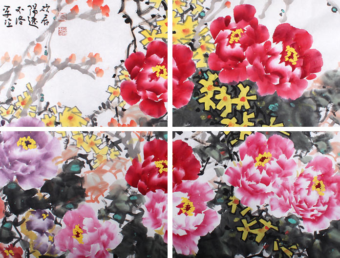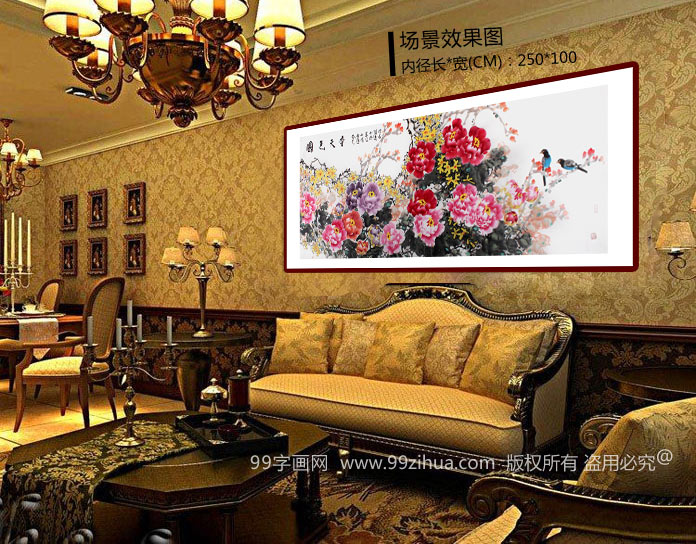 【作品簡評】(99字畫網(wǎng)藝術(shù)評論員路豐)曲逸之先生的這幅牡丹畫作品《國色天香》,繁花怒放,朵朵牡丹或含苞,或開放,色澤亮麗,紅花綠葉相映的恰到好處,墨色酣暢淋漓,墨韻非凡,繁花似錦,兩只雀鳥在花枝間休憩賞景,一幅富貴溫馨的畫面映入畫幅中,是辦公室字畫、客廳字畫之選!