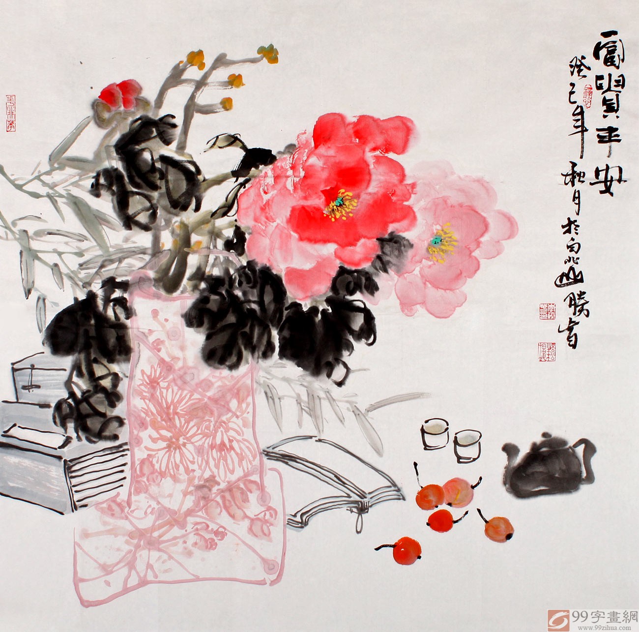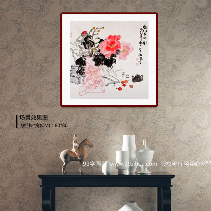 【作品簡評】(99字畫網藝術評論員曉曼)此幅牡丹畫作品《富貴平安》,繪一幾何花瓶中插入幾簇牡丹,花開艷麗,碩大飄香,莖蔓相連,墨韻酣暢,其下書籍一本、茶壺一個、酒壺、枇杷、隨意放之。右方的落款為:富貴平安,居室懸掛定會帶來富貴、平安,同時也體現(xiàn)出一種隨意自在的暢然之情。