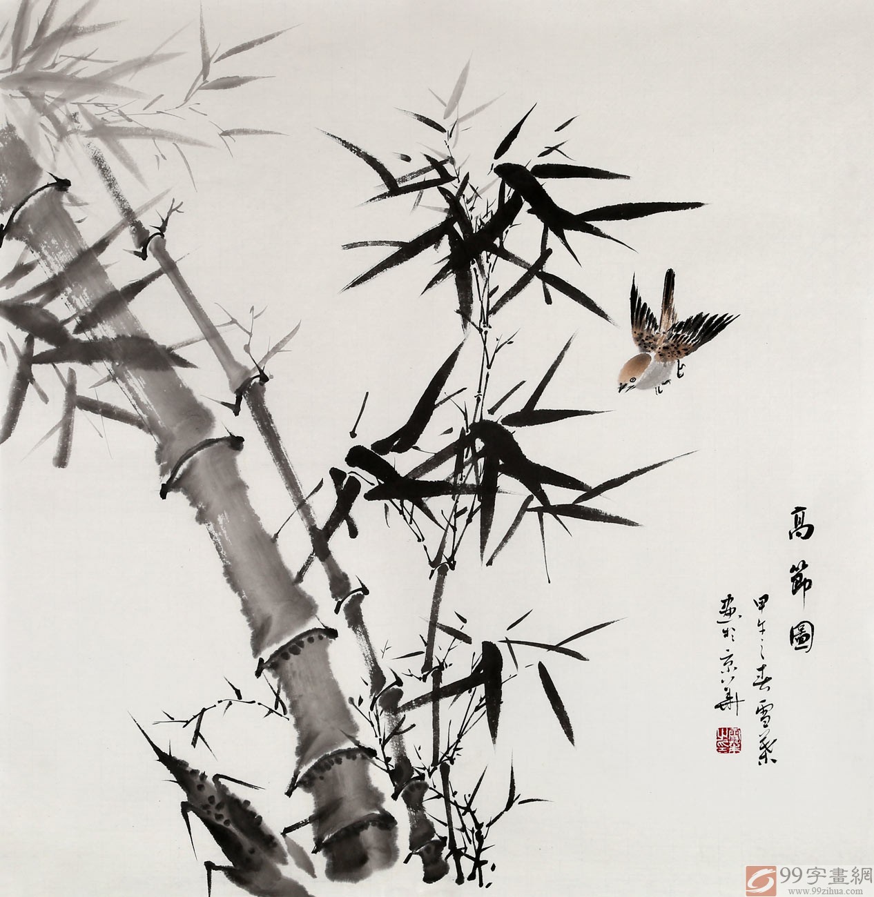 【作品簡(jiǎn)評(píng)】(99字畫網(wǎng)藝術(shù)評(píng)論員路豐)何華賢先生一生酷愛畫竹,他對(duì)自己的每一幅作品要求嚴(yán)格,追求盡善盡美,欣賞先生的水墨畫竹子給人以健康挺拔、盎然向上、生機(jī)勃勃之感,先生的國(guó)畫竹子堅(jiān)韌不拔、胸有成竹、頂天立地、清雅脫俗。這幅《高節(jié)圖》蒼勁有力,直沖云天,竹子分兩簇,形成對(duì)比、疏密有致、竹竿筆挺,竹葉濃密有致。何華賢先生的竹子圖總能喚起一種熱愛生活、詩(shī)味盎然、積極向上的情感。