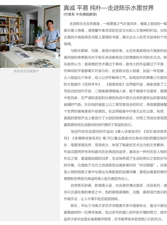 陳樂(lè),字子謙,別署古風(fēng)堂,河南大學(xué)藝術(shù)學(xué)院畢業(yè),后進(jìn)修于中國(guó)美術(shù)學(xué)院、國(guó)家畫(huà)院中國(guó)山水畫(huà)創(chuàng)作院,師從著馮遠(yuǎn)、龍瑞、劉國(guó)輝、唐勇力等名畫(huà)家。 現(xiàn)為中國(guó)山水畫(huà)創(chuàng)作院畫(huà)家,河南省美術(shù)家協(xié)會(huì)會(huì)員,河南書(shū)畫(huà)院院聘畫(huà)家,洛陽(yáng)王鐸書(shū)畫(huà)院副院長(zhǎng)兼秘書(shū)長(zhǎng),孟津美協(xié)副主席兼秘書(shū)長(zhǎng)。