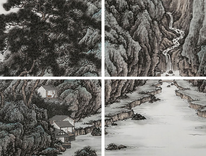 吳顯剛所作山水勾勒精調(diào),刻畫嚴(yán)謹(jǐn),古意橫生。主要以積墨為之,層層遞加。墨法干濕并用,凝重恬靜,變化莫測。古人有云:“山水有法,豈能草草。”這也是吳顯剛的座右銘。所以他主張:“入古法取其精,近生活畫其神。以繪畫態(tài)度說話,以作品的質(zhì)量說話,不吹牛,多讀書才是一位真正合格的畫家?!?/p>