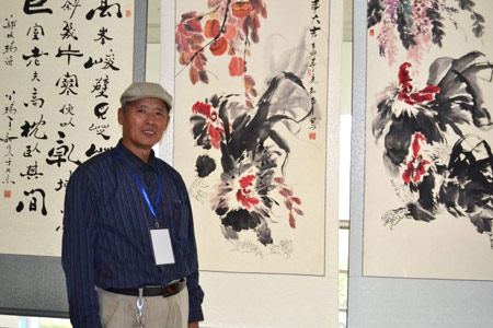 和平大師也畫國(guó)畫。在國(guó)慶與仲秋同賀的熱點(diǎn)基地,我見(jiàn)識(shí)到和平大師用墨汁和利用用其他畫家畫牡丹剩下的油彩,畫出奔騰如飛的駿馬圖與有趣的小雞吉祥圖?!断瞾?lái)到》畫上的大公雞與小雞雛望向上方一角,像篩底的蜘蛛網(wǎng)垂下一根銀色絲線,下面吊著一只黑蜘蛛。另一幅《雞趣》有一群形態(tài)各異的雞,有一只雞回頭嘴啄向地,仔細(xì)一看是要啄小小的綠色螳螂,綠色螳螂抬起細(xì)線樣的脖子,翹起硬夾子前腿抵抗。當(dāng)和平大師畫一對(duì)比冀雙飛的馬時(shí),立在一旁觀看的熱點(diǎn)網(wǎng)友等待夫妻倆,便稱倆人都屬馬。后來(lái)又說(shuō)一家三匹馬,兒子也屬馬。可是那幅雙馬圖已畫完。大家便鼓動(dòng)和平大師補(bǔ)上一匹小馬。馬補(bǔ)上了,大家贊不絕口,都說(shuō)天衣無(wú)縫。我也感覺(jué)這幅馬的畫面更完整完美,意境深遠(yuǎn)了。和平大師說(shuō)自己的書法不好,請(qǐng)書畫家朋友耿振洲給自己的畫簽字,讓人不能不敬佩他的謙虛和品德!