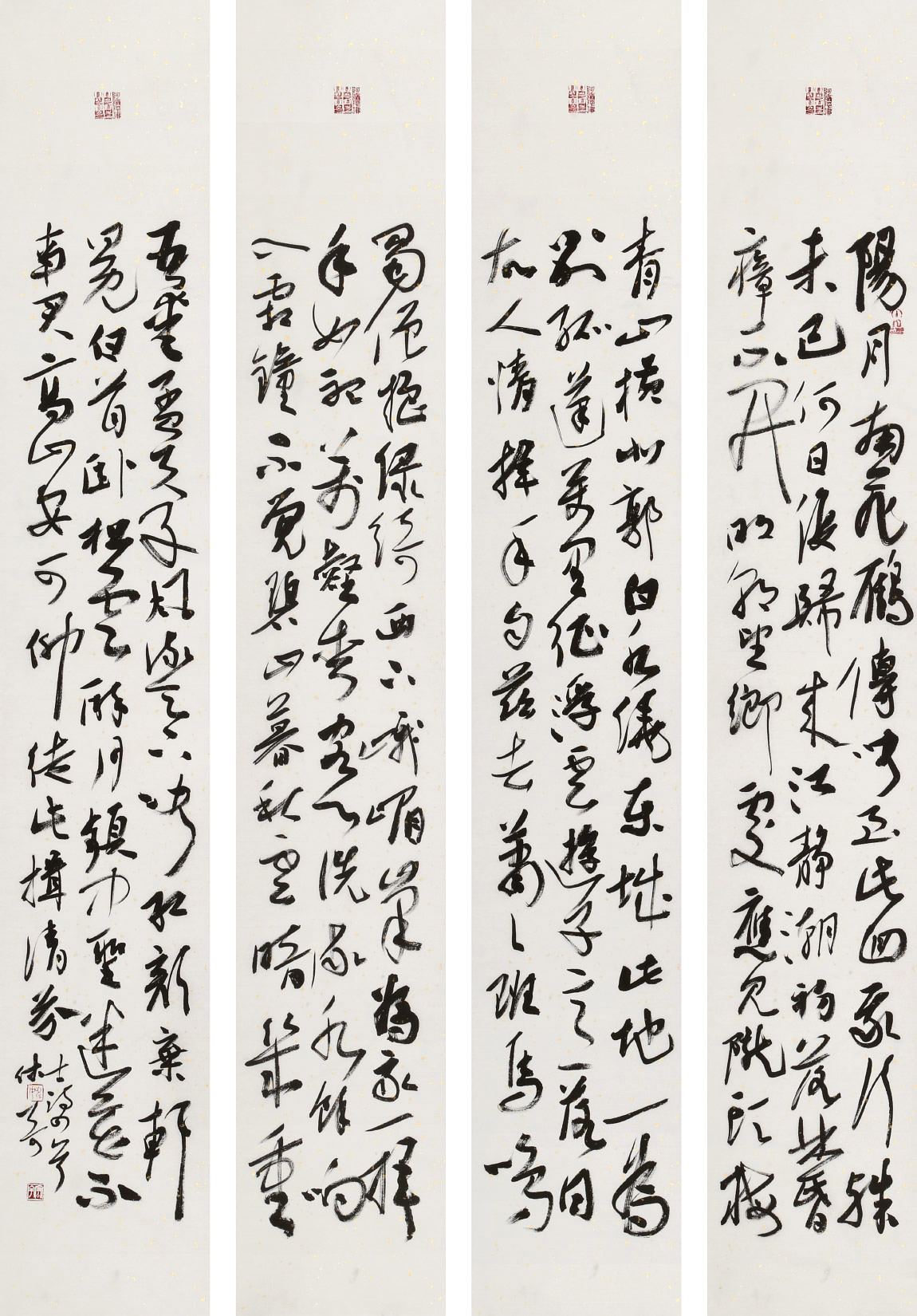 對(duì)于少字和大字作品,在我看來(lái),應(yīng)該是宏宇先生對(duì)書(shū)法這門造型藝術(shù)的一種嘗試,從落筆,用墨,造型技巧,空間構(gòu)成等方面,尤能表達(dá)出其功力和性情。上個(gè)世紀(jì)末,現(xiàn)代書(shū)法極其流行,現(xiàn)代書(shū)法作品最多的就是大字和少字作品。這和西方藝術(shù)思潮的涌入,還有諸多學(xué)院派書(shū)法家的倡導(dǎo)有著直接的聯(lián)系,現(xiàn)代書(shū)法藝術(shù)打開(kāi)了一個(gè)不同于傳統(tǒng)書(shū)法的局面,當(dāng)然,前提是深厚的傳統(tǒng)功力,但是隨著一些追隨者的投機(jī)取巧,不重視書(shū)法藝術(shù)的根本,唯形式至上,丑惡之風(fēng)泛濫。宏宇先生則認(rèn)為:“一幅書(shū)法作品的創(chuàng)作狀態(tài)不是去做去畫(huà),而是水到渠成不得不發(fā)”,也就說(shuō),在基礎(chǔ)訓(xùn)練的時(shí)候,要一筆一劃慢慢去寫(xiě),往經(jīng)典碑帖靠近,一旦得法,就必須訓(xùn)練高速書(shū)寫(xiě)的行筆能力,即是控筆。他推陳出新,身體力行,其書(shū)法并沒(méi)有遠(yuǎn)離經(jīng)典,而是根植傳統(tǒng),在符合藝術(shù)審美趣味的范圍內(nèi)充分發(fā)揮。我們說(shuō)一個(gè)優(yōu)秀的書(shū)法家必須具備各方面的素質(zhì),對(duì)技法的把握僅僅是其中很小的一部分,兼之悟性、學(xué)養(yǎng)、見(jiàn)解,才有可能達(dá)到一種全新的境界,宏宇先生認(rèn)為,習(xí)書(shū)的認(rèn)識(shí)先要有一個(gè)宏觀的界定,或可叫“書(shū)法觀”,就是要確立一個(gè)正確的書(shū)法理念和宏觀的研習(xí)目標(biāo)。書(shū)法作為藝術(shù)最終是要進(jìn)入人的精神層面,并呈現(xiàn)一個(gè)人的人格主體。